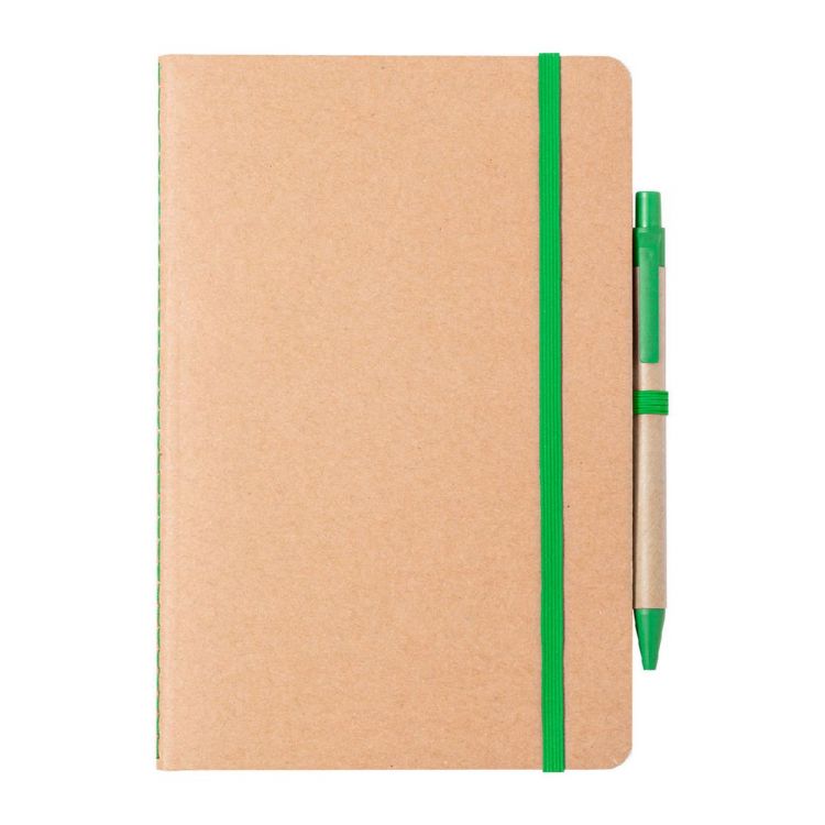 Carnet de notes recouvert de carton recyclé avec 60 feuilles vierges et élastique en caoutchouc coloré, format A5. Comprend un stylo à bille en plastique paille de blé encre bleue.