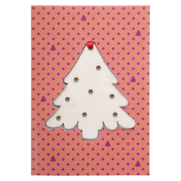 Carte de Noël personnalisable avec impression graphique des deux cotés incluant une décoration pour sapin de Noël en bois de bouleau, avec ruban rouge. Incluant également une enveloppe C6. Quantité minimale 100 pcs