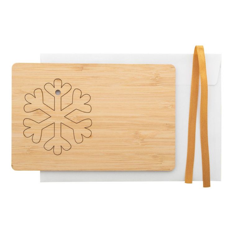 Carte de Noël en contreplaqué de bambou, avec une décoration de sapin de Noël et un ruban doré. Enveloppe postale C6 comprise. Livrée avec ruban détaché