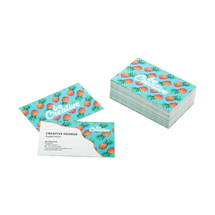 100 cartes de visite sur mesure imprimées en quadri des deux côtés. Papier blanc mat, 350 g/m². Livrées dans une boîte en papier blanc