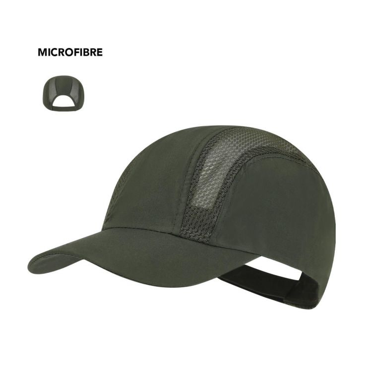 Casquette sportive en microfibre douce de conception. Fermeture ajustable en velcro et panneaux en filet respirant.