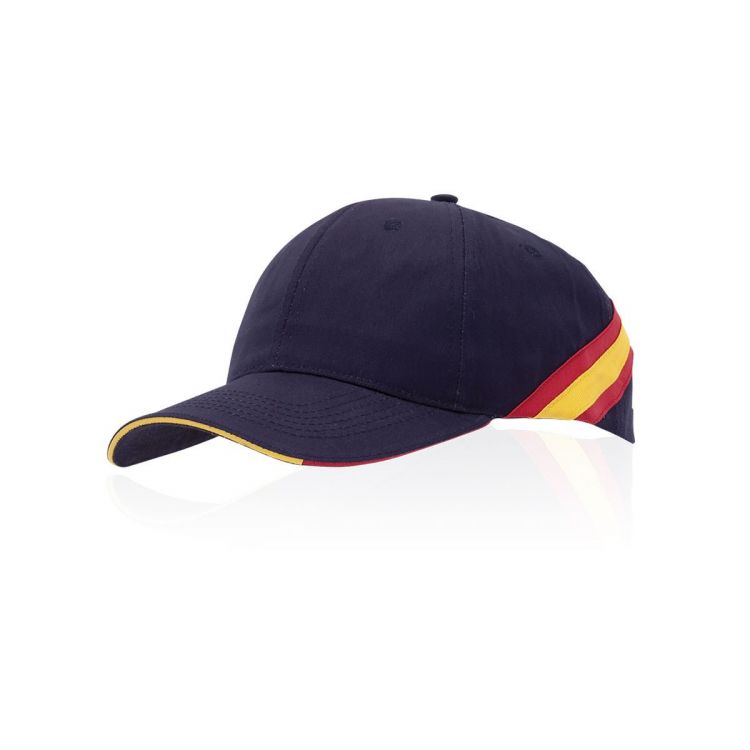 Casquette avec motif drapeau espagnol en coton peigné. 6 panneaux, avec sandwich tricolore et drapeau latéral et arrière. Avec orifices de ventilation brodés et fermeture réglable par velcro.