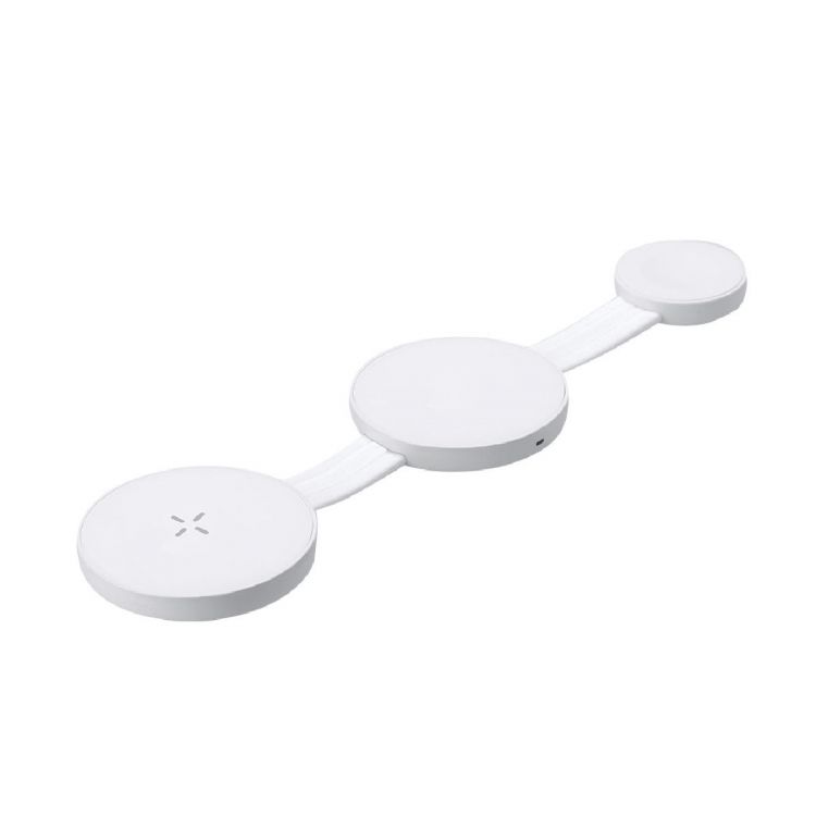 Chargeur sans fil magnétique de 15 W 3 dans 1, en ABS. Conçu pour la charge simultanée de smartphones, casques et montres connectées, et ultra-compact en taille. Un gadget tout-en-un : pliable, portable, très polyvalent et conçu fonctionnelment. Connexion USB Type C - câble inclus -.