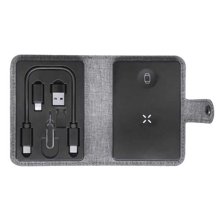 Station de charge complète en 300D RPET. Boîtier compact avec fermeture à bouton et incluant une station de charge sans fil Qi pour smartphones, écouteurs et montres connectées. Fournie avec un câble de connexion Type-C à chaque extrémité, plus des adaptateurs USB et lightning/micro USB. L'ensemble est complété par un éjecteur de carte SIM et un compartiment pour stocker une carte Micro SIM. Avec logo RPET.Le matériau RPET est fabriqué à partir de plastique recyclé, favorisant ainsi la réutilisation des déchets plastiques et contribuant à la durabilité de la planète. (couleur gris)