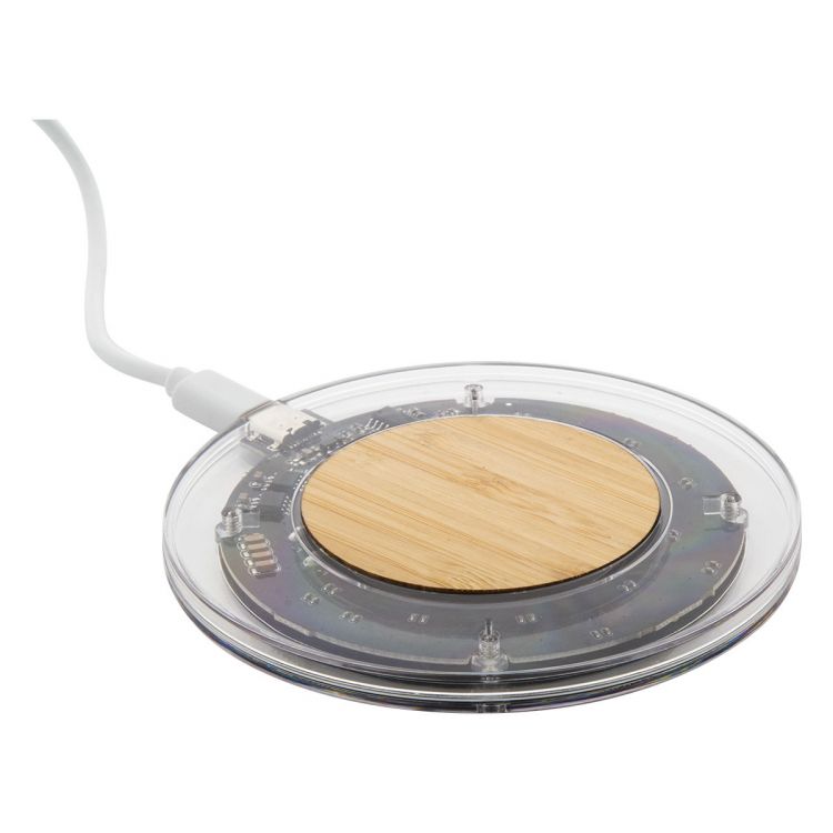 Chargeur rapide sans fil (15W) dans un boîtier en plastique transparent et en bambou avec des composants électroniques visibles. Câble de chargement USB inclus