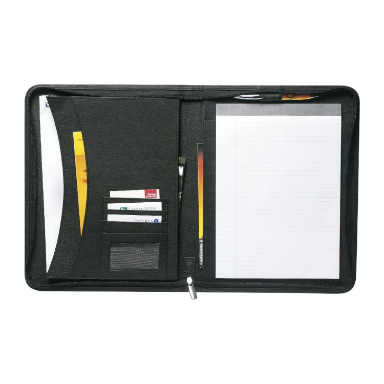 Conférencier A4 zippé en cuir reconstitué (synderme) muni d'une plaque métallique, livré avec bloc-notes, sans stylo.