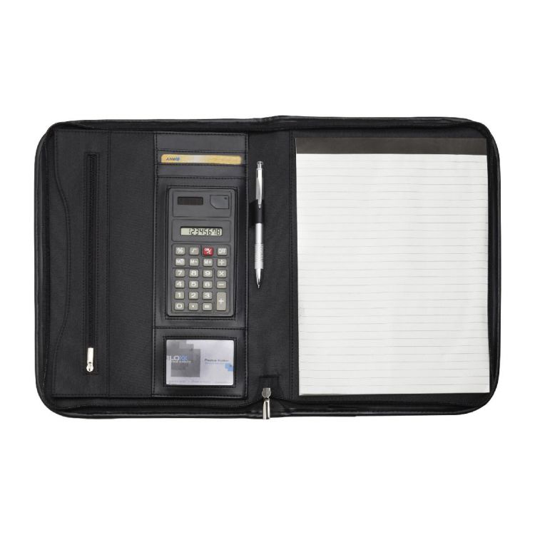Conférencier zippé en microfibre et PVC avec poignées rétractables, livré avec bloc-notes et calculatrice, sans stylo.