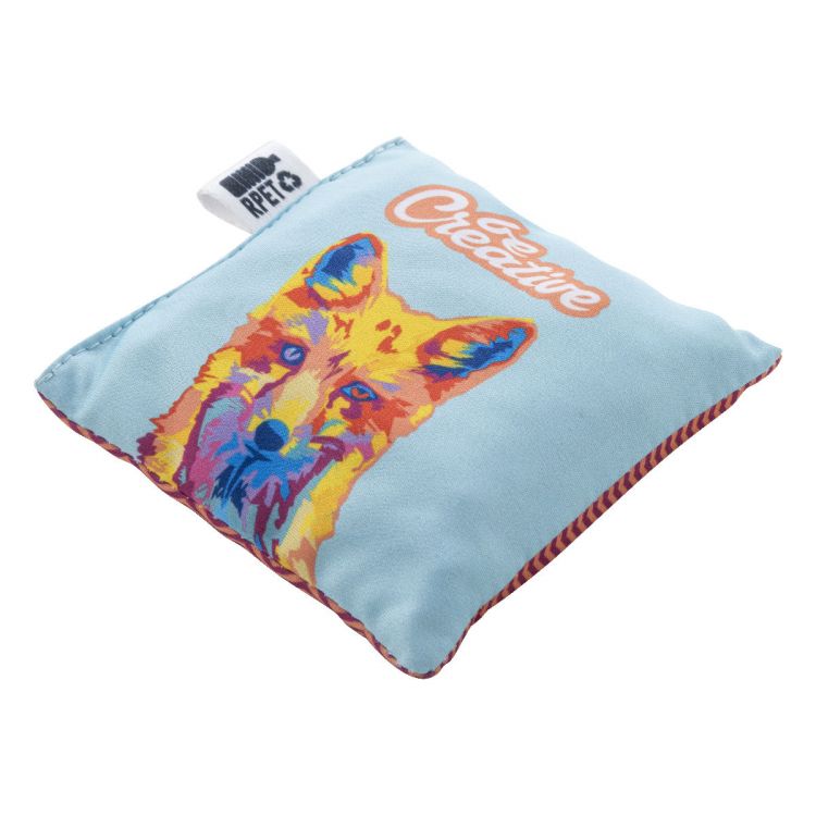 Coussin chauffant en noyaux de cerises, fabriqué sur mesure et dessus en microfibre RPET. De taille compacte, il est conçu pour être utilisé sur les oreilles. Impression sur base de quadri en sublimation sur toute la surface et portant l'étiquette RPET. Quantité minimale : 50 pièces