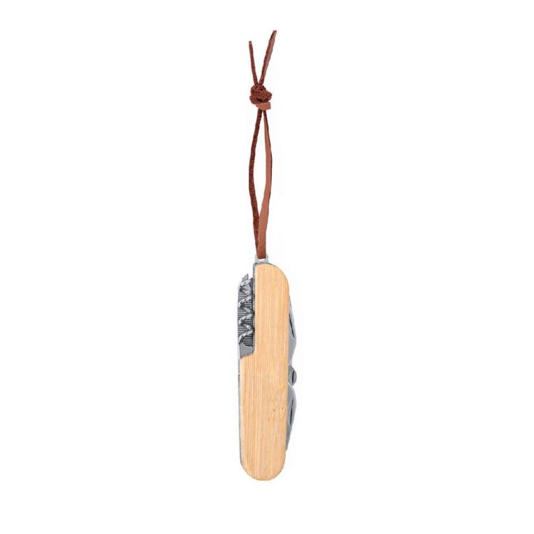 Couteau de poche multifonctions en acier inoxydable avec manche en bambou et 9 fonctions. Avec bandoulière en similicuir