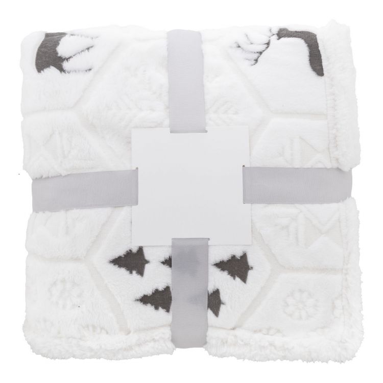 Couverture de Noël luxueuse en RPET doublée avec motif hiver gaufré. Doublure en flanelle RPET 270 g/m² et doublure réversible en polaire sherpa RPET 210 g/m². Entourée d'un ruban et d'une carte en papier imprimable, de couleur gris
