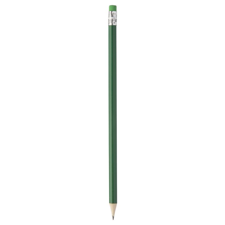 Crayon en bois avec gomme de couleur assortie. Livré taillé.