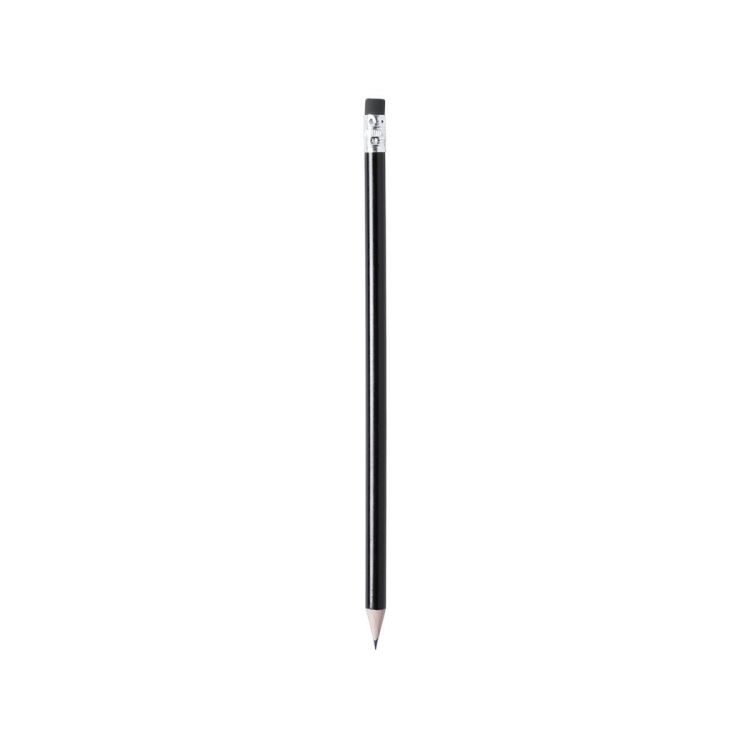 Crayon en bois finition brillante. Avec corps rond et gomme assortie. Disponible dans une large gamme de couleurs. Mine noire et pointe taillée.