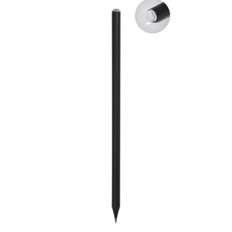 Crayon à mine de bois noir orné d'une pierre précieuse en acrylique. Mine taillée, HB, de couleur blanche