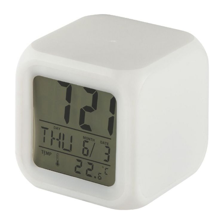 Cube avec changement de couleurs d'ambiance intégrant l'heure, le réveil, le jour, la date et la température, piles incluses.