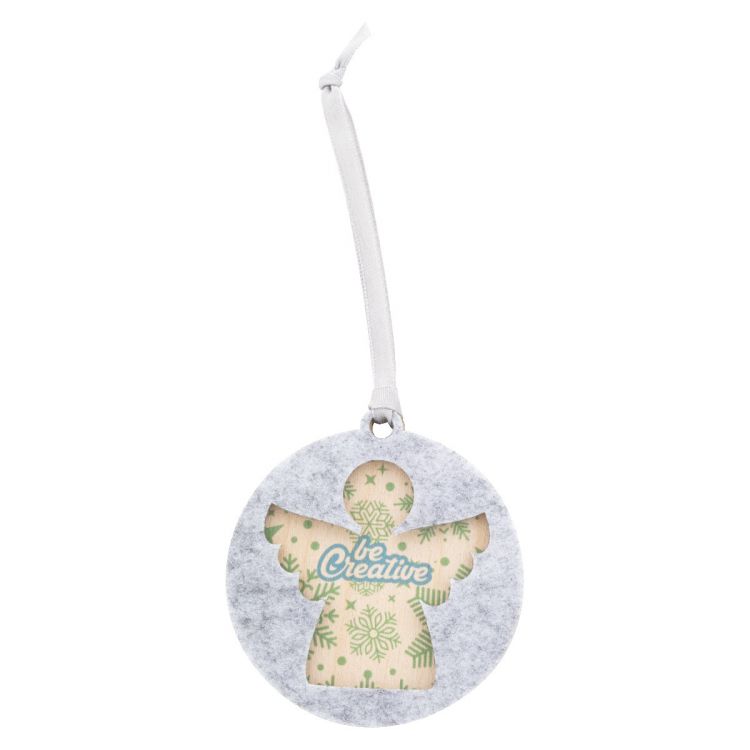 Décoration d'arbre de Noël en feutrine RPET double couche et contreplaqué de bouleau sur mesure avec ruban argenté et motif de Noël découpé sur la couche supérieure. Prix Le prix comprend l'impression UV LED sur la couche inférieure. Quantité minimale : 100 pièces