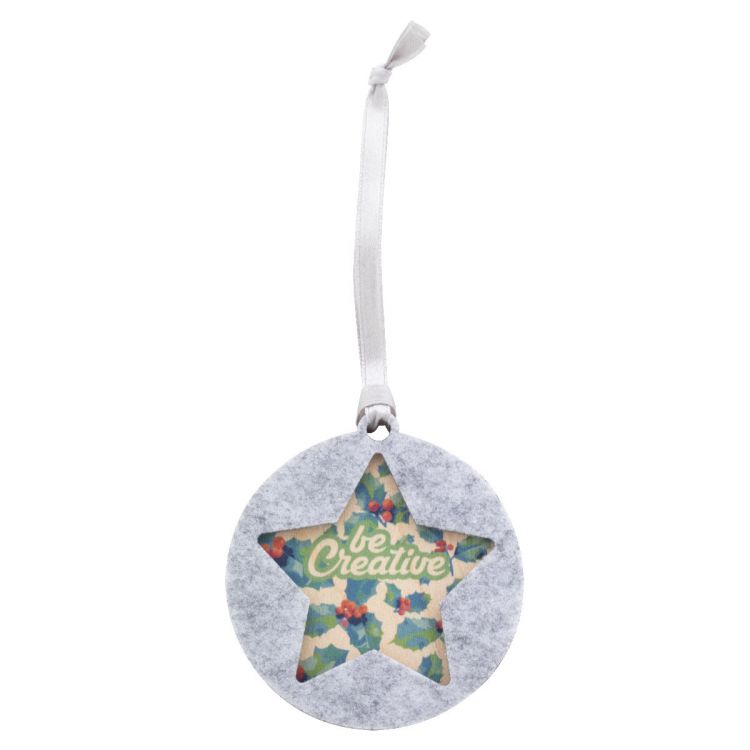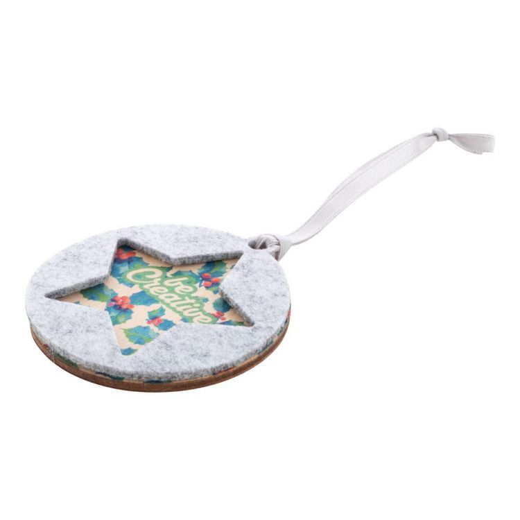 Décoration d'arbre de Noël en feutrine RPET double couche et contreplaqué de bouleau sur mesure avec ruban argenté et motif de Noël découpé sur la couche supérieure. Prix Le prix comprend l'impression UV LED sur la couche inférieure. Quantité minimale : 100 pièces