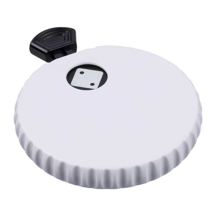 Dé mécanique en ABS recyclé avec bouton-poussoir sur le dessus. Appuyez pour faire tourner le mécanisme interne et révéler un nombre aléatoire de 1 à 6. Comprend un décapsuleur au dos et un petit logo en ABS recyclé. Emballé dans un polybag recyclé.