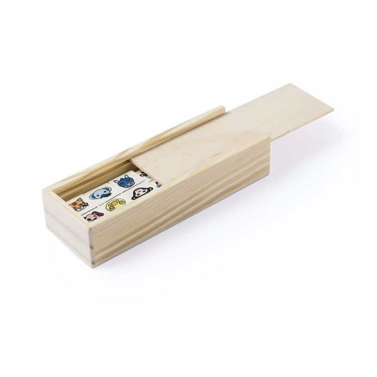 Dominos en bois avec dessins d´animaux. Comprend 28 pièces de bois présentées dans un coffret en bois avec couvercle. (couleur naturel)