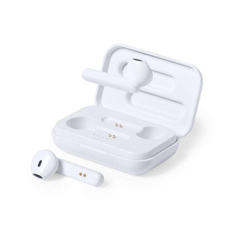Écouteurs antibactériens avec connexion Bluetooth® 5.0. Couleur blanche au finition brillante. Conception ergonomique, comprenant un bouton de commande tactile intégré dans l'écouteur, avec une base de chargement de couleur assortie. Fonction mains libres et câble micro USB rechargeable inclus. Présenté dans un étui individuel de luxe avec couvercle à charnière et dans une boîte design. Les produits avec des traitements antibactériens sont capables de réduire considérablement les niveaux bactériens présents sur les surfaces des matériaux, grâce à l'ajout d'agents microbiens statiques permanents, avec une grande efficacité pour inhiber et prévenir la contamination bactérienne. Article selon la norme ISO 22196, qui détermine l'activité antibactérienne des matières plastiques et des surfaces non poreuses. (couleur blanche)