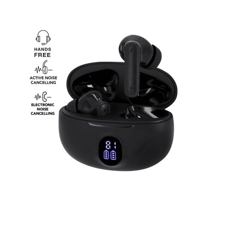 Écouteurs intra-auriculaires avec connexion Bluetooth® 5.4, avec fonction mains-libres et annulation de bruit. De design ergonomique, incluent un bouton de contrôle tactile intégré dans l'écouteur, avec une base de chargement assortie et un affichage extérieur de l'état de la batterie par écouteur. Batterie intégrée de 230 mAh. Manuel d'instructions en espagnol et en anglais.