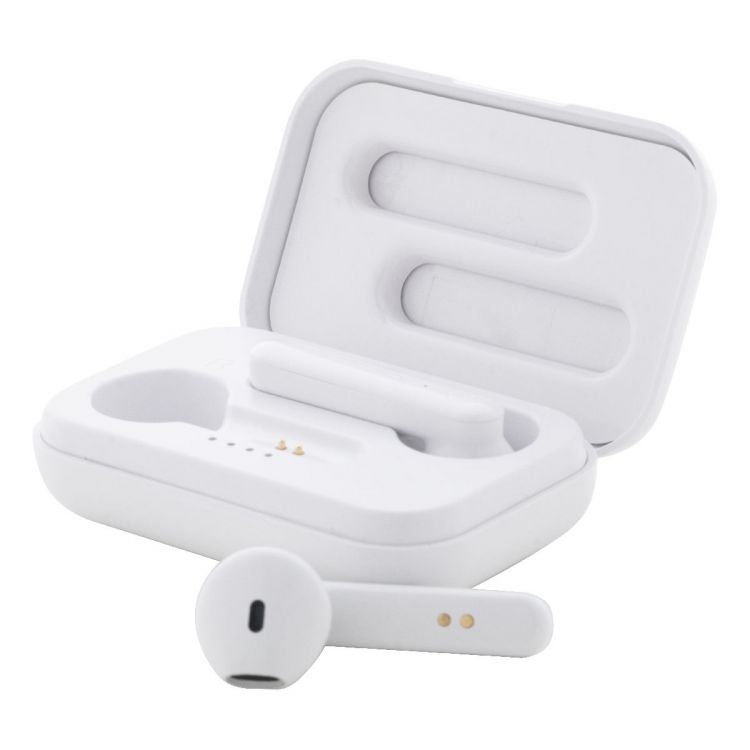 Écouteurs stéréo sans fil (TWS) en plastique ABS recyclé avec fonction d'appel mains libres, dans un étui chargeur en plastique avec une batterie de 400 mAh. Câble de chargement USB inclus, de couleur blanche
