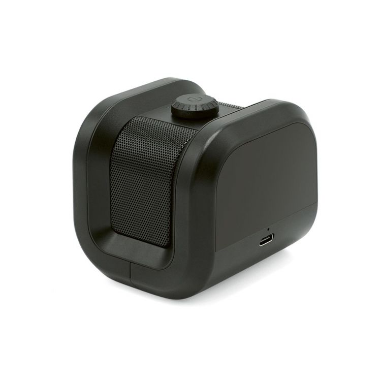 Enceinte compacte Boomz avec des basses puissantes. Fabriquée en ABS recyclé. Zones personnalisables des deux côtés.