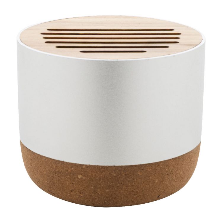 Enceinte sans fil dans un boîtier en aluminium recyclé avec dessus en bambou et base en liège naturel. Avec batterie rechargeable (400 mAh). Câble de chargement USB inclus.
