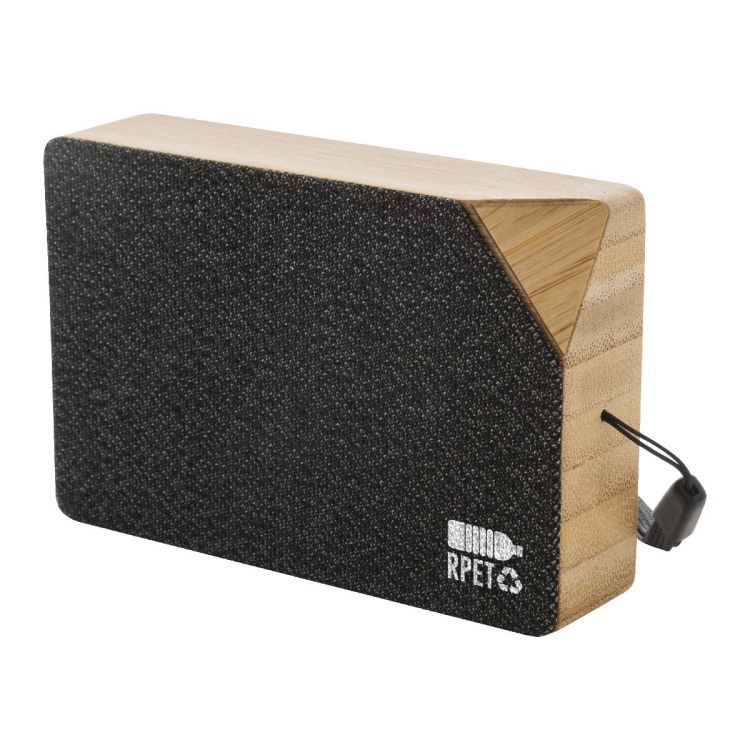 Enceinte sans fil en bambou avec maillage en polyester RPET, chargeur solaire intégré, dragonne et batterie rechargeable (300 mAh). Câble de chargement USB inclus