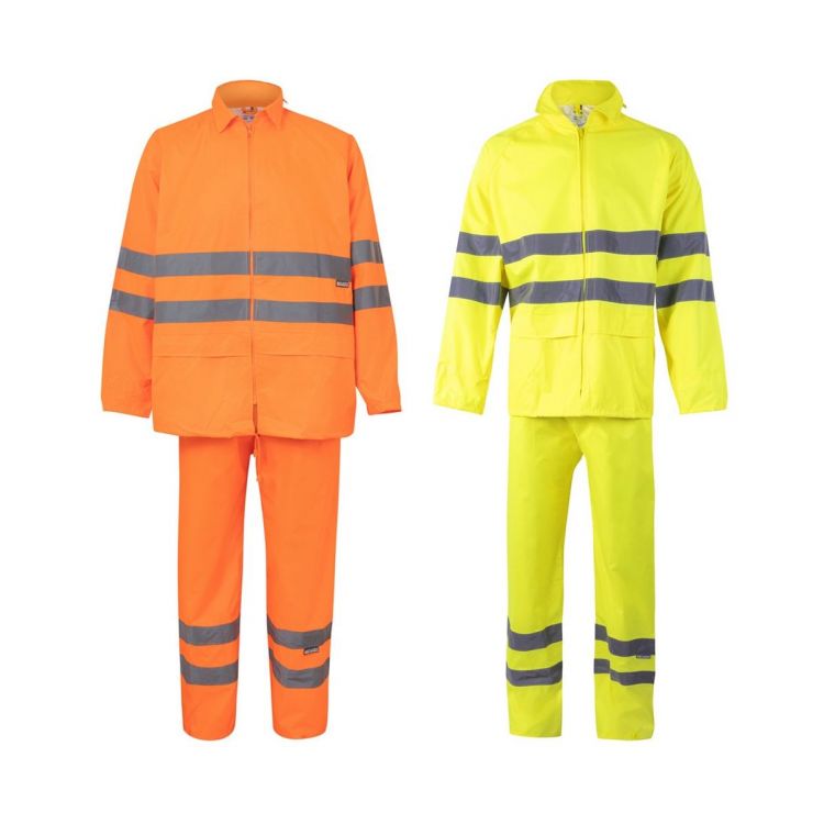 Ensemble de pluie (130g/m²), en polyester (100%) avec revêtement PU.Veste avec fermeture éclair centrale, bandes réfléchissantes sur le torse et les manches et capuche cachée dans le col. La maille intérieure en polyester (100 %) et les œillets métalliques favorisent la respirabilité. La veste est réglable à l'aide d'un bouchon et possède deux poches inférieures cachées avec rabat.Pantalon : ceinture élastique et fermeture à boutons. Il comporte des bandes réfléchissantes sur le bas du pantalon et des ouvertures latérales avec rabat pour accéder aux poches. Boutons réglables au bas du pantalon. Produit conforme au règlement (UE) 2016/425, certifié par EN20471 et classe Nº 3
