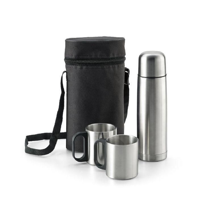 Ensemble de bouteille thermique et tasses en acier inoxydable. L'ensemble comprend 2 tasses avec capacité jusqu'à 200 mL, 1 bouteille à double paroi avec capacité jusqu'à 500 mL, et un sac 600D avec poignée réglable. Produit en couleur argent