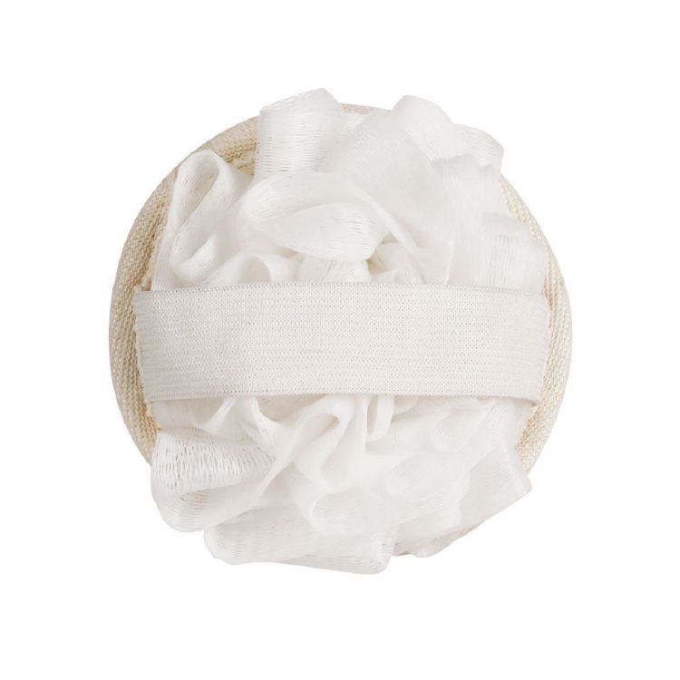 Éponge exfoliante 2-en-1 en fibre de PE. D’un côté, éponge douce, de l’autre côté, éponge exfoliante avec sangle ajustable pour la paume de la main. (couleur naturel)