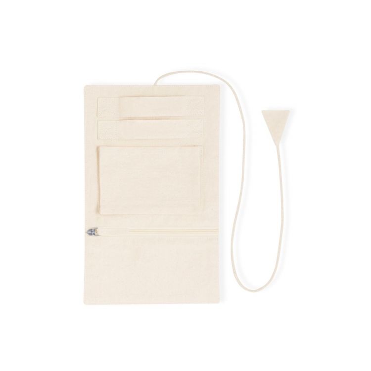 Boîte à bijoux pliable en coton, pour ranger des objets personnels précieux. Fabriqué en 3 parties de couleur naturelle : partie supérieure avec des rubans, partie centrale avec poche et partie inférieure avec poche à glissière, pouvant le plier et le tenir fermement avec son cordon assorti. (couleur naturel)