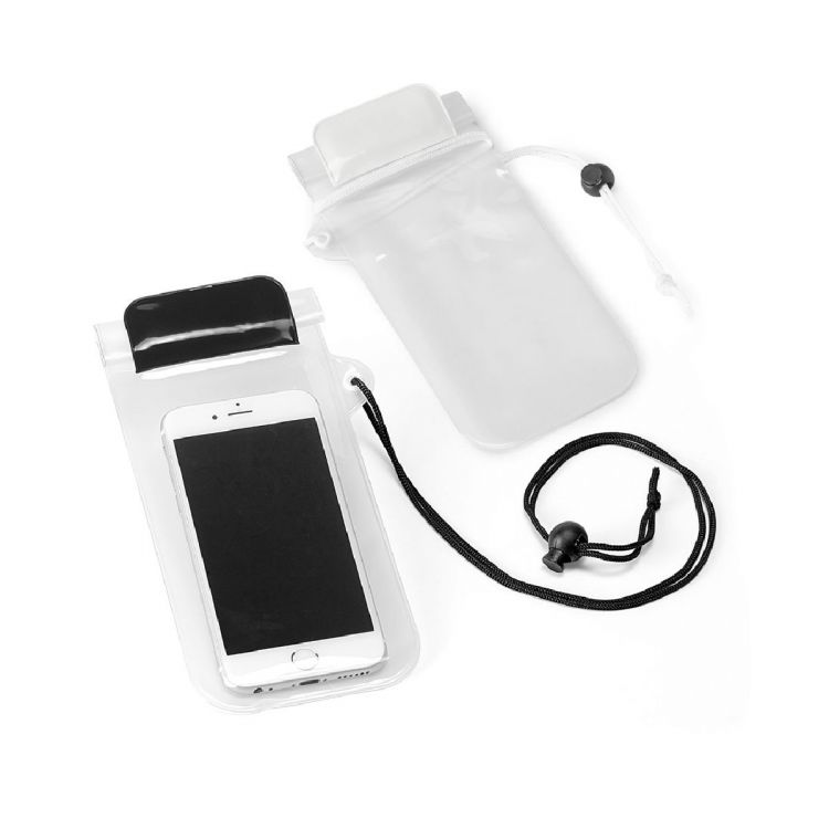 Pochette étanche pour téléphone portable en PVC avec sangle réglable et fermeture à ressort. Transparent à l'avant et blanc mat à l'arrière. Face avant tactile. L'étui est doté d'une fermeture hermétique