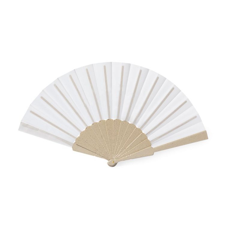 Evantail avec des tiges en fibre de bambou et un tissu en RPET, obtenu à partir de matières plastiques recyclées. Présenté dans une boîte individuelle éco-conçue. (couleur naturel)