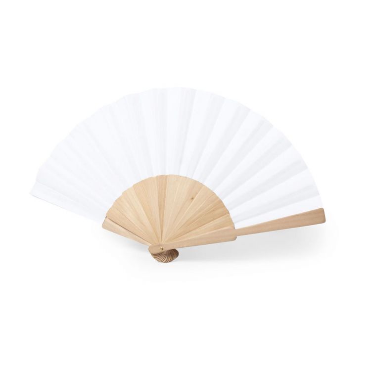 Ventilateur avec des nervures en bois et un tissu en matériau RPET, obtenu à partir de matières plastiques recyclées. Présenté dans une boîte individuelle éco-conçue. (couleur blanche)
