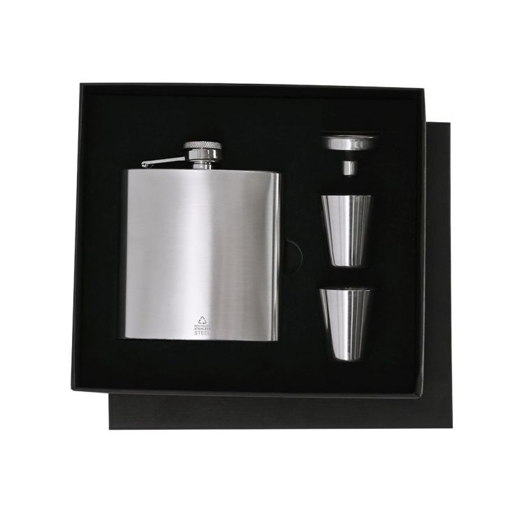 Ensemble de flasque avec accessoires en acier inoxydable recyclé. Inclut : - Flasque de 175 ml avec système anti-goutte et fermeture à vis pour un stockage sécurisé et sans déversements. - Deux verres mesureurs de 30 ml de capacité. - Entonnoir de dosage, facilitant le remplissage.Comprend un symbole d'acier inoxydable recyclé. Présenté dans une boîte noire.L'acier est l'un des matériaux les plus demandés et peut être trouvé presque partout, des produits d'usage quotidien aux grandes constructions. Possédant d'innombrables propriétés, notamment sa durabilité et son haut degré de réutilisation, il constitue une alternative très appréciée dans les solutions de durabilité. Correctement traité, il permet d'obtenir de nouvelles ressources d'utilisation infinie. (couleur argent)