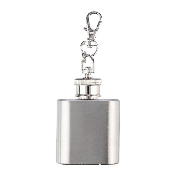Flasque en acier inoxydable 304 d’une contenance de 30 ml avec porte-clés mousqueton dans une boîte cadeau kraft.