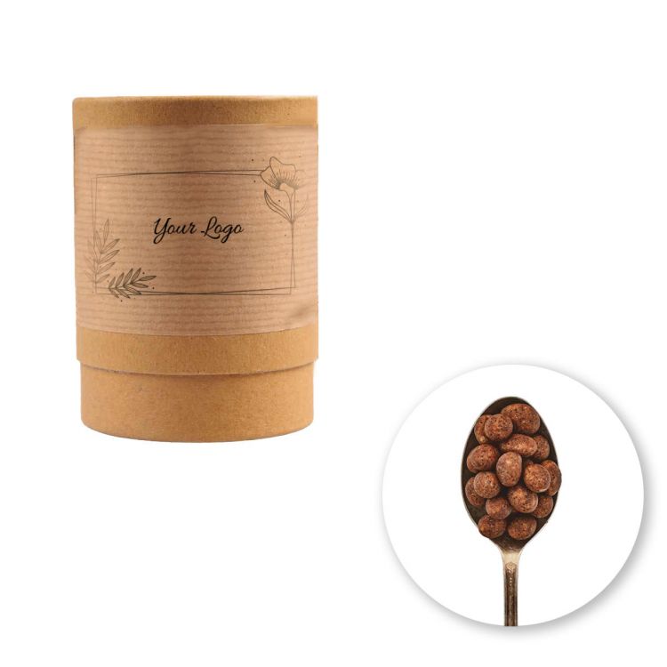 Paquet de fruits secs. Les couleurs correspondent au type de snack : Brun foncé pour les grains de café enrobés de chocolat noir (100 g), Chocolat pour les groseilles à maquereau enrobées de chocolat noir saupoudré de cacao (100 g), Cuivre pour les raisins secs enrobés de chocolat blanc saupoudré de cacao (100 g). g), café (100g), Bronze aux écorces d'orange enrobées de chocolat noir avec une pointe d'Earl Grey (100g), Or aux cacahuètes caramélisées (100g). Emballage : Boîte en papier kraft avec fenêtre transparente sur le devant. Possibilité de personnalisation sur l'étiquette adhésive à appliquer sur le couvercle (finition papier : blanc ou kraft, à choisir lors de la commande). Durée de conservation minimale - 6 mois.