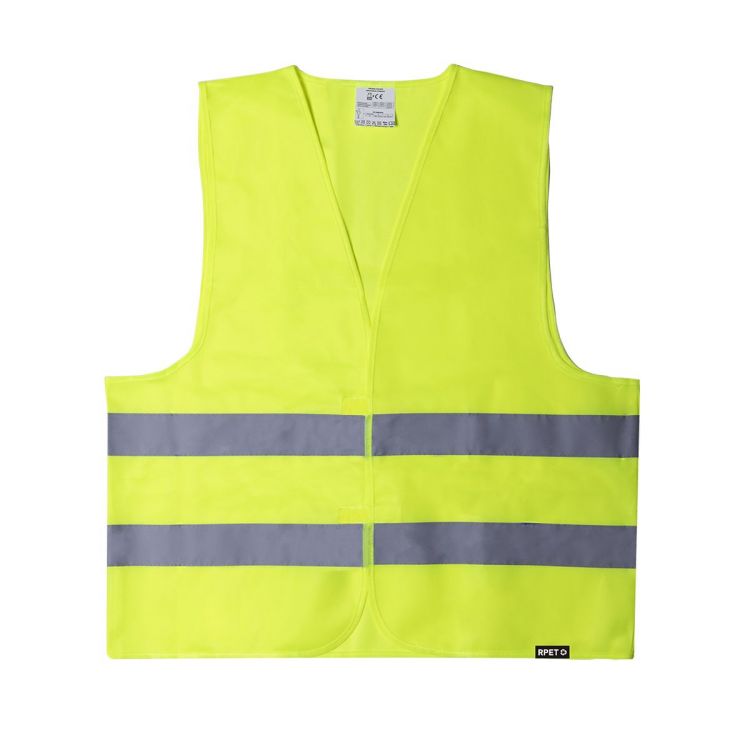 Gilet réfléchissant haute visibilité, homologué selon les normes de sécurité CE fabriqué en RPET. Avec double bande réfléchissante autour du corps et fermetures en velcro. Taille unique pour adulte.Le matériau RPET est fabriqué à partir de plastique recyclé, afin de promouvoir la réutilisation des déchets plastiques et d'aider à la durabilité de la planète. (couleur jaune)