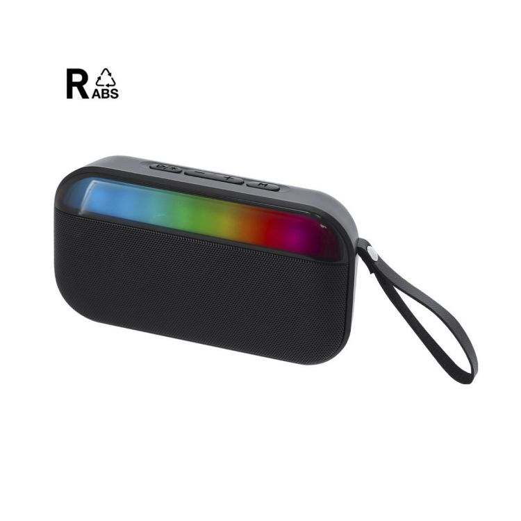 Enceinte stéréo Bluetooth® de 5W avec lumière multicolore en ABS recyclé (RABS). Avec lumières LED multicolores, fonction mains-libres, lecteur USB et accepte les cartes TF/Micro SD jusqu'à 32 Go. Inclut une douce sangle en PU assortie. Connexion Bluetooth 5.3 avec panneau de contrôle intégré. Inclut un label RCS, qui atteste de son engagement envers l'utilisation de matériaux recyclés.
