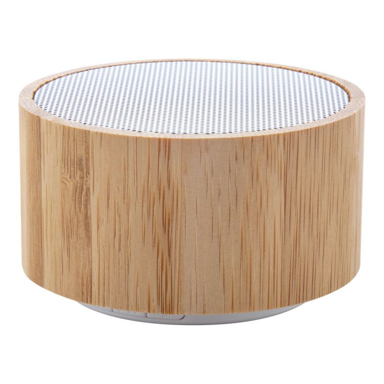 Haut-parleur sans fil dans un boîtier en bambou avec fonction d'appel mains libres, radio FM et batterie rechargeable intégrée. Câble de chargement USB inclus