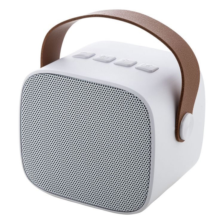 Enceinte sans fil en ABS recyclé avec sangle de transport en cuir PU et batterie rechargeable intégrée (1200 mAh). Câble de chargement USB inclus, de couleur blanche
