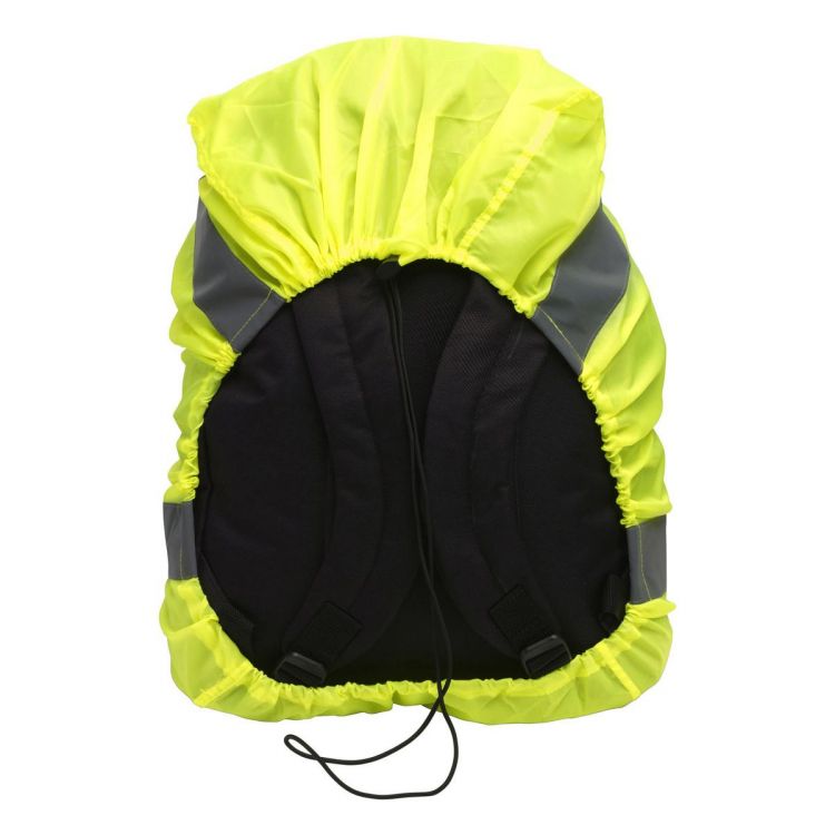 Housse de sac à dos fluo comprenant 2 bandes réfléchissantes et une bande de serrage élastique. Usage promotionnel.