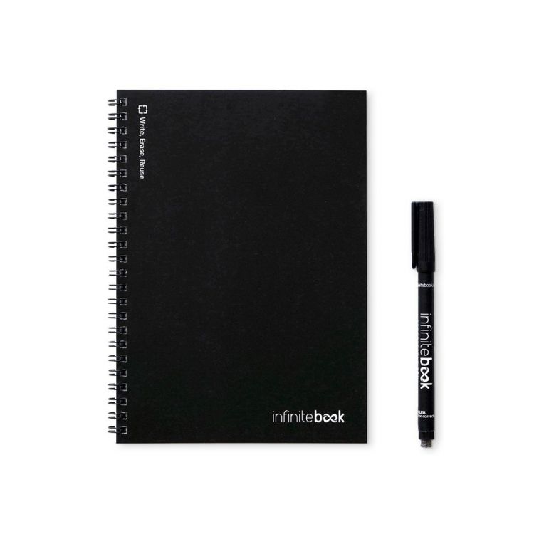 Cahier A5 - « Infinitebook » - avec couverture souple et anneaux de couleur assortie. Contient 15 pages unies de type tableau blanc et un marqueur noir. Ce bloc-notes permet d'écrire et d'effacer facilement et constitue une solution pratique pour réduire la consommation de papier. Les notes peuvent être scannées. Fabriqué en Europe. Livré dans une enveloppe en papier kraft avec un autocollant. Produit en couleur noir