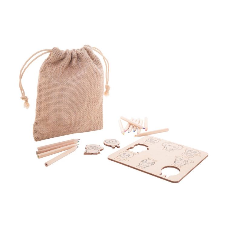 Jeu d'association de formes à colorier en contreplaqué de bouleau avec pochette en jute. Comprend des figures découpées thématiques (8 pièces) et des crayons de couleur en bois (12 pièces), livré dans une boîte en papier