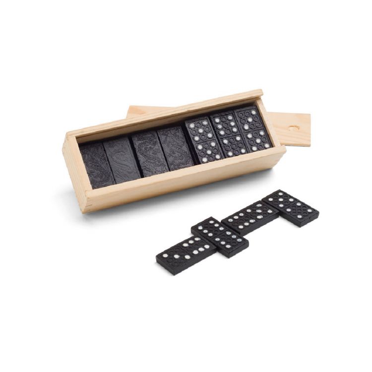 Jeu de dominos dans une boîte en bois avec couvercle. Les pièces en MDF sont noires avec des détails en relief et blancs. Le produit étant fabriqué à partir de matériaux naturels, la couleur du produit ainsi que le résultat de l'impression peuvent varier d'un produit à l'autre. Produit en couleur naturel
