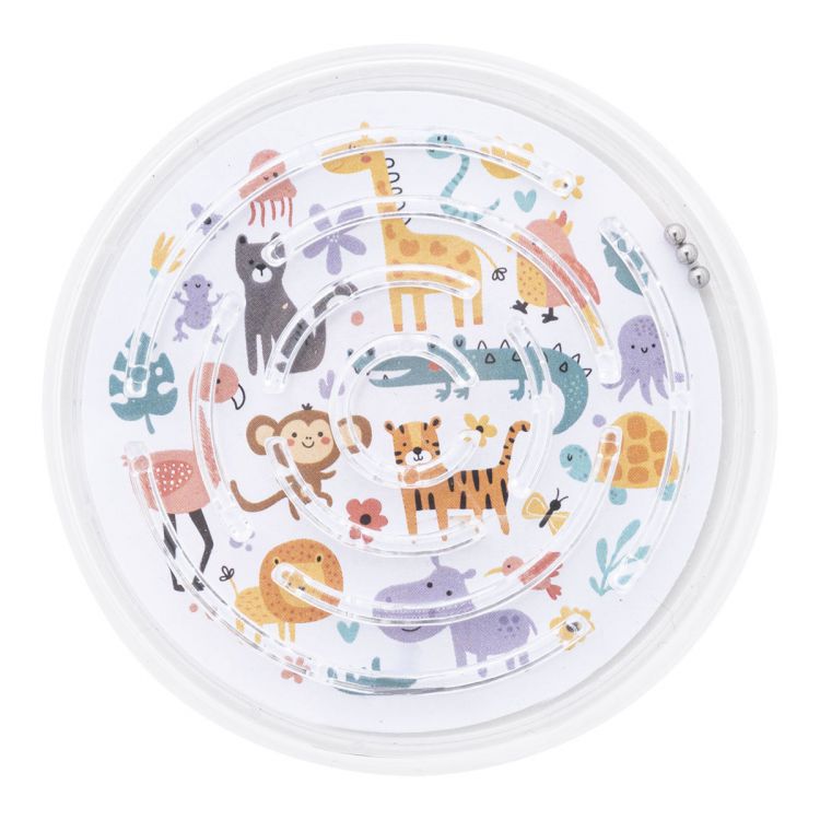 Jeu du labyrinthe en PS recyclé de forme ronde avec trois billes en métal. Avec insert en papier personnalisable en quadri. Le prix comprend l'impression numérique sur les deux faces. Quantité minimale : 100 pièces