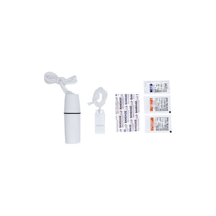Kit d'excursion de 6 accessoires présenté dans une trousse en ABS résistant avec fermeture à vis étanche, avec un cordon lanyard pratique. Inclut du gel hydroalcoolique, de la protection solaire SPF30, des bandages et un sifflet. (couleur blanche)