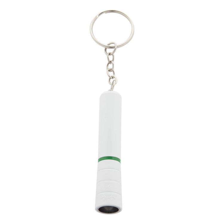 Mini lampe de poche en plastique avec 1 LED et porte-clés en métal. Livrée avec pile bouton.