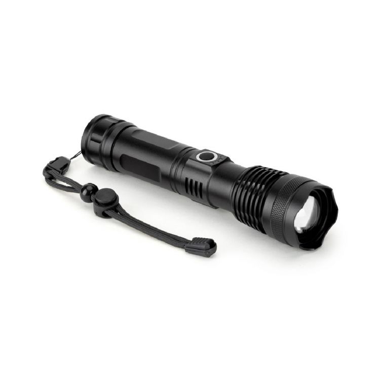 Lampe torche rechargeable de 10 W en aluminium recyclé (100 % rAL). La lampe torche dispose des fonctionnalités suivantes : LED de 500 lumens, 5 modes pour différentes occasions (100 %, 50 %, 30 %, flash et SOS), fonction de zoom télescopique en étendant la partie avant, indicateur du niveau de batterie. La batterie a une capacité de 3 000 mAh et peut être rechargée à l'aide d'un câble USB-C. Comprend un câble de recharge UBS-A / USB-C. Livré dans une boîte cadeau en papier kraft. Produit en noir